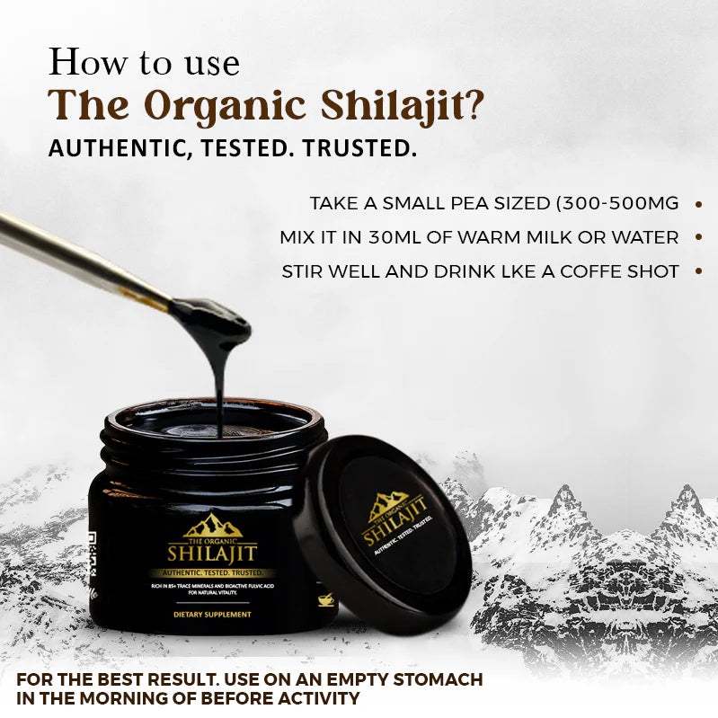 To experience the full benefits of The Organic Shilajit resin, take a pea-sized amount (300โ500 mg), dissolve it in warm water, and consume it on an empty stomach, ideally 30 minutes before breakfast. It can also be taken with green tea during the dayโjust avoid adding sugar. For nighttime use, dissolve it in warm milk with a teaspoon of honey and drink it about an hour before sleep. Since Shilajit supports natural detoxification, stay well-hydrated throughout the day.